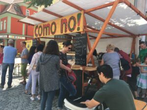 Unser Stand auf dem Ilmenauer Altstadtfest ist bereits seit Jahren eine feste Institution. Schon am Tag vor Beginn des Stadtfestes treffen sich Vereinsmitglieder und Unterstützer und bereiten Empanadas vor. Empanadas sind Teigtaschen mit unterschiedlicher Füllung ( z.B. Käse-, Spinat- oder Fleisch). Während des Altstadtfestes stehen wir dann in der Marktstraße. Der Duft, der von unserem Stand ausgeht, lockt viele Hungrige an, die dann nicht nur Empanadas essen und leckeren Kaffee aus Nicaragua trinken, sondern sich auch über unseren Verein und die Projekte informieren. So erreichen wir mehrere Ziele auf einmal: Wir informieren über die Situation in Lateinamerika und über das Engagement von ¡Cómo no!, wir werben Interessenten, die bei uns mitmachen möchten und wir sammeln “ganz nebenbei” noch Geld für die Projekt. Denn der Erlös jeder verkauften Empanada und jedes Kaffees geht direkt zu 100% in unsere Projekte.